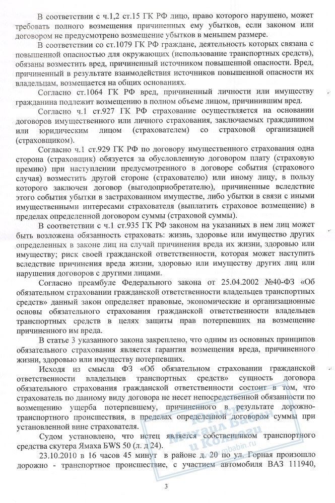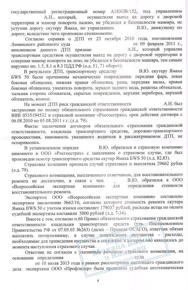 В результате ДТП, произошедшего на улице Горной, был причинен ущерб транспортному средству истца – скутеру «Ямаха». Автомобиль виновника ДТП был застрахован по полису ОСАГО в компании «Росгосстрах», поэтому гражданин В.Ю. обратился в указанную компанию за возмещением материального ущерба. Сумма страховой выплаты составила 30000 рублей и была передана В.Ю.