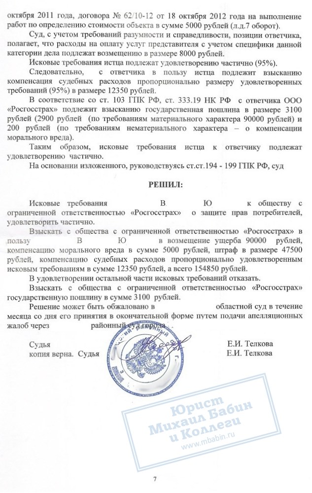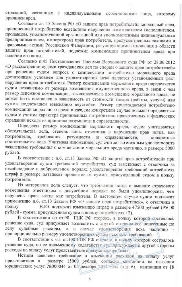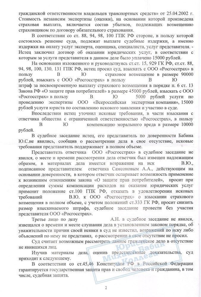 В.Ю. не согласился с размером выплаты. Было проведено 2 независимые экспертизы. В результате суд вынес решение обязать ООО «Росгосстрах» выплатить в пользу истца не только сумму материального ущерба 90 000 рублей, а также компенсацию морального вреда, возмещение всех судебных расходов и штраф за несоблюдение закона о защите прав потребителей 47500 рублей. Всего гражданину В.Ю. по решению суда было дополнительно выплачено 154 000 рублей.